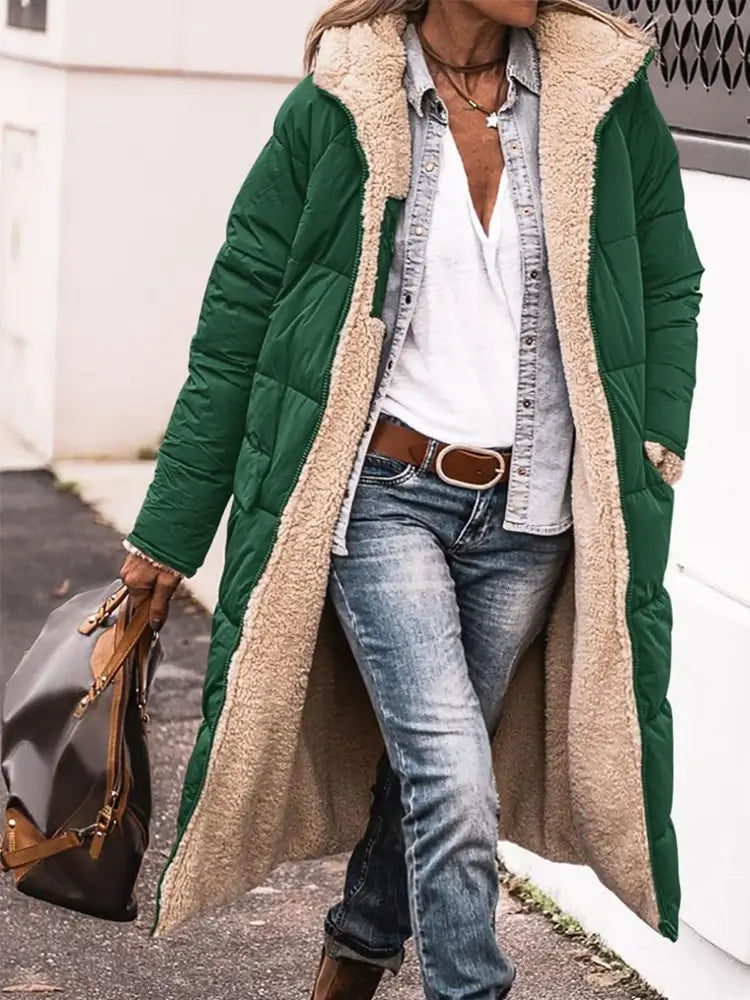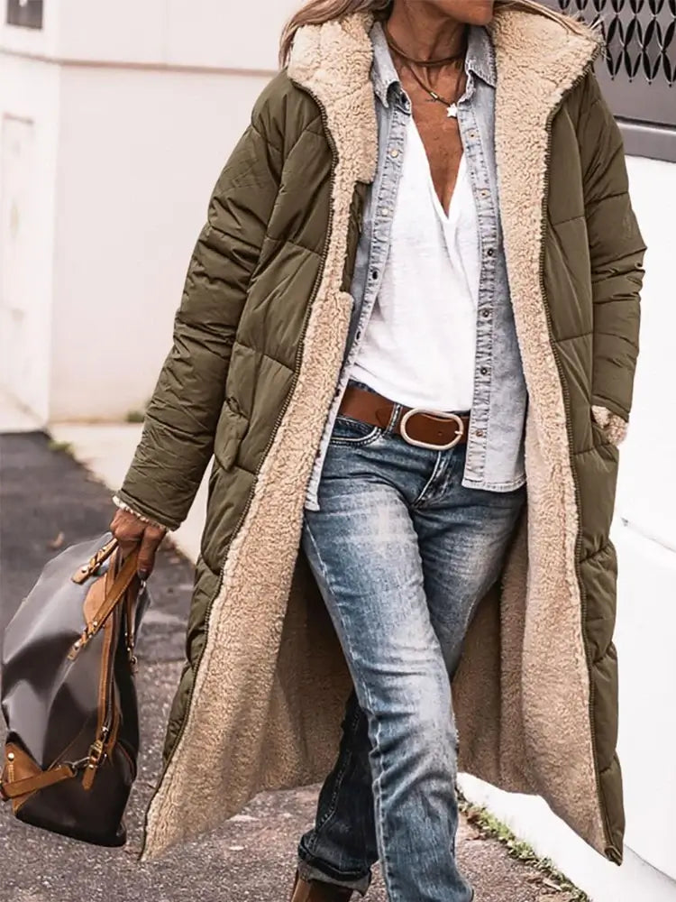 Klaar voor de koude dagen – Deze lange, comfortabele winterjas is de perfecte metgezel voor vriestemperaturen. Met zijn zachte teddy voering en dubbelzijdige ontwerp biedt hij warmte en veelzijdigheid, waardoor je straalt in elke winterlook.